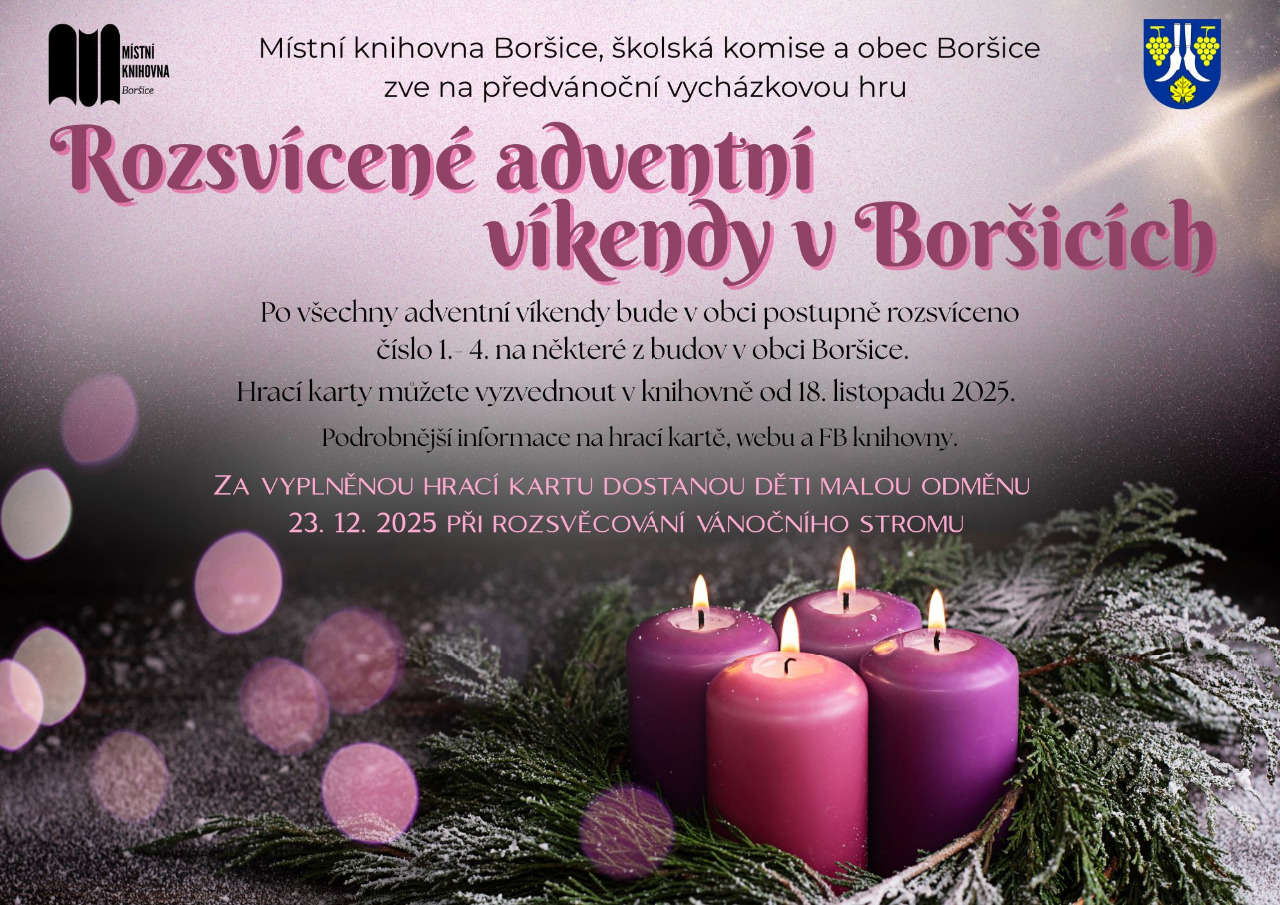 Po všechny adventní víkendy bude v obci postupně rozsvíceno číslo 1- 4 na některé z budov v obci Boršice.
